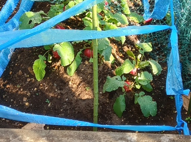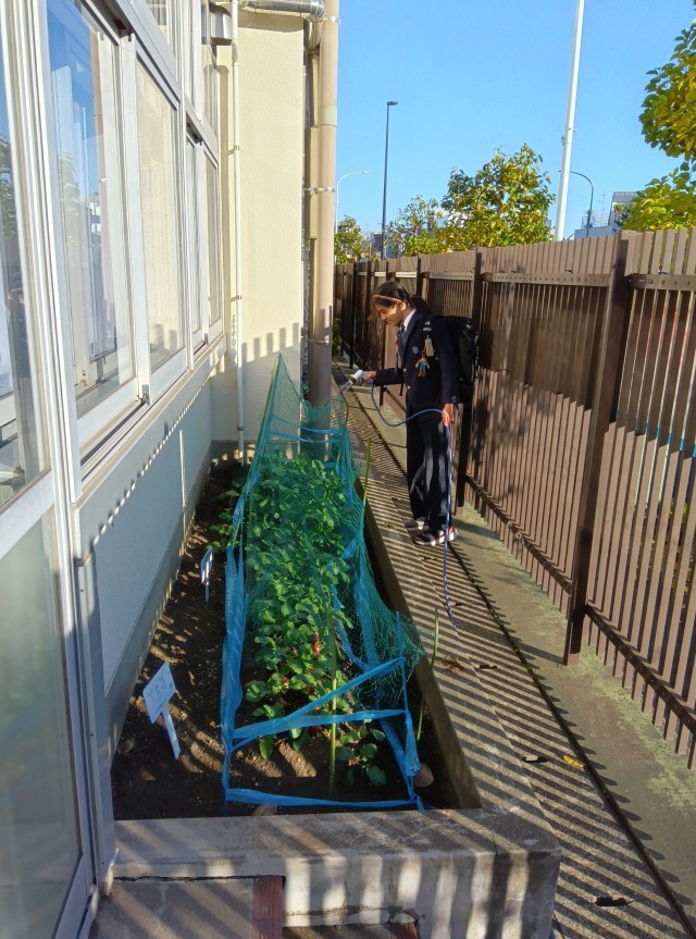 写真はおおぐま学級の生徒が、「おおぐまたけ」で大根と二十日大根の水やりをしている様子です。二十日大根が大きくなっていますね。収穫が楽しみです。(副校長)