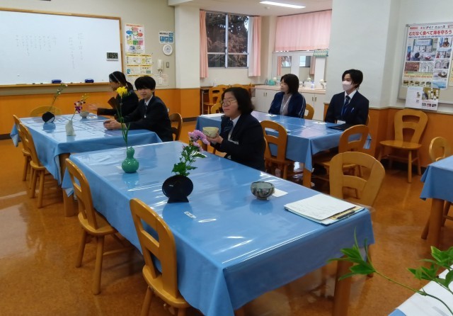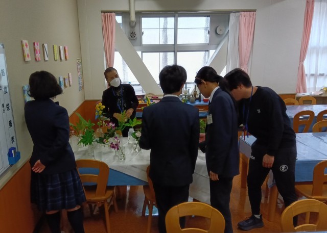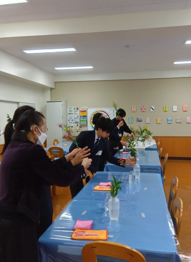 写真は、昨日のおおぐま学級の華道体験の様子です。一輪の花が講師の先生方のご指導により生き生きとした表情に変わる様子に驚きました。生徒一人ひとりの感想のことばを心から褒め讃えてくださり、生徒の心も満たされていました。