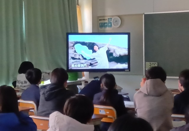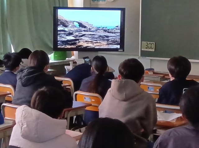 さて、写真は昨日の1年生の理科の授業の様子です。地震による隆起を説明している場面です。約50センチ隆起している断層の写真や2メートル隆起した海岸の様子が隆起の前後の写真で示されています。既存の写真だけではなく、理科講師が実際に現地に訪れて撮影したものがあり、生徒の関心を高めている様子が生徒の背中から伝わってきます。
