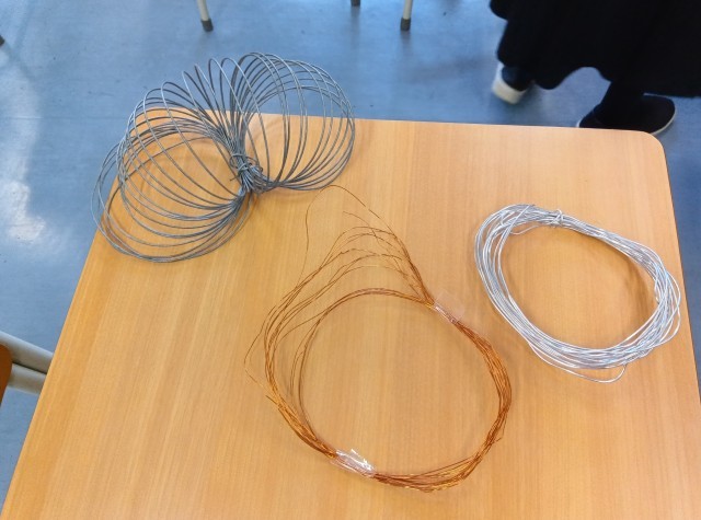糸以外の例えば銅線でも聞こえるのかなど、試してみました。(副校長)