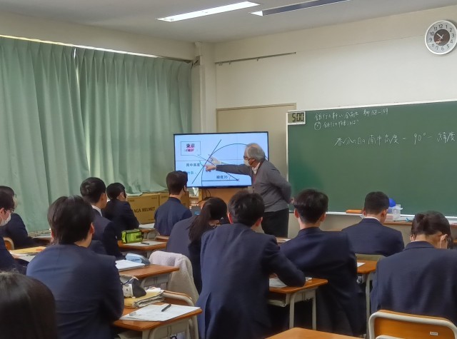 南中高度の求め方には平行線の同位角・錯角がでてくるのですね。ここでも地軸の傾き23.4度がでてきますね。(副校長)