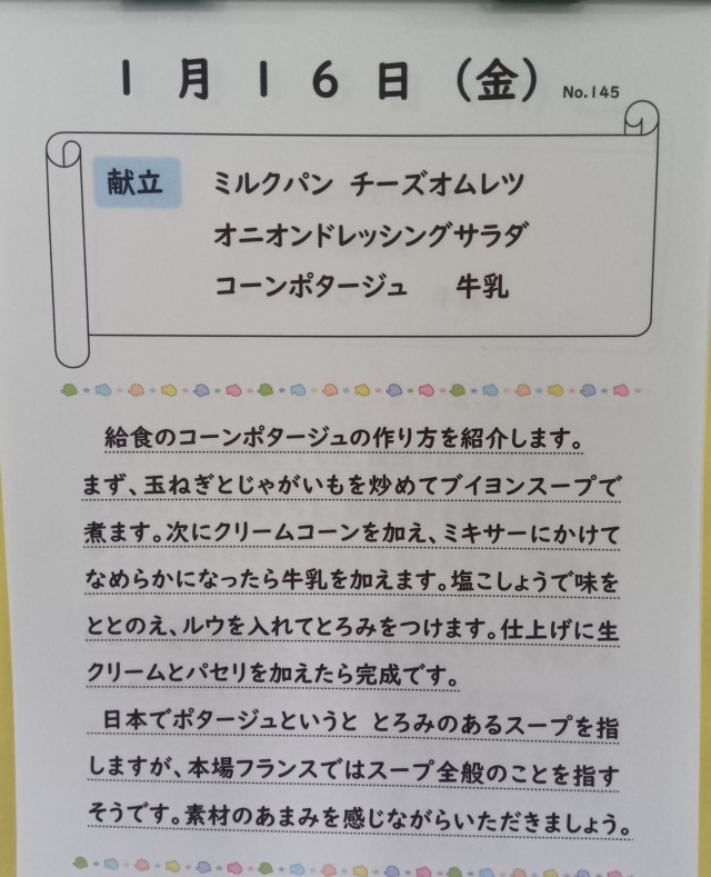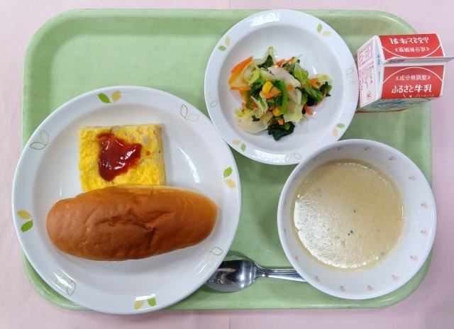 チーズオムレツには、玉ねぎ、ベーコン、レンズ豆とチーズが入っています。ケチャップソースもただのケチャップだけでなく中濃ソースと赤ワインが入っています。給食に必要な豆類を上手に使っています。