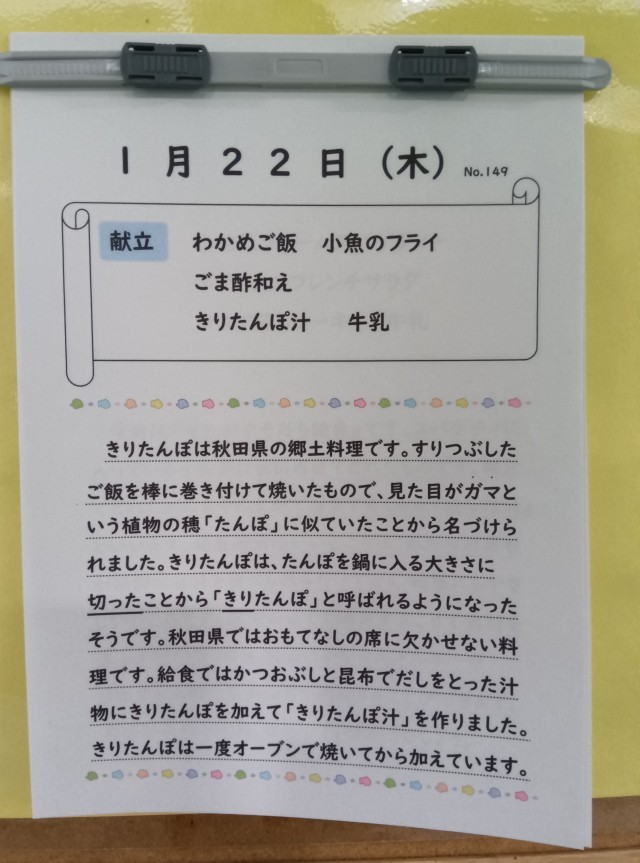 きりたんぽ汁は、ごぼう、セリ、舞茸、大根、人参、豆腐などときりたんぽが入っています。きりたんぽの形が崩れていないのは、一度オーブンで焼いているからなのですね。いつもながら手の込んだ料理に脱帽です。出汁がとても美味しいです。