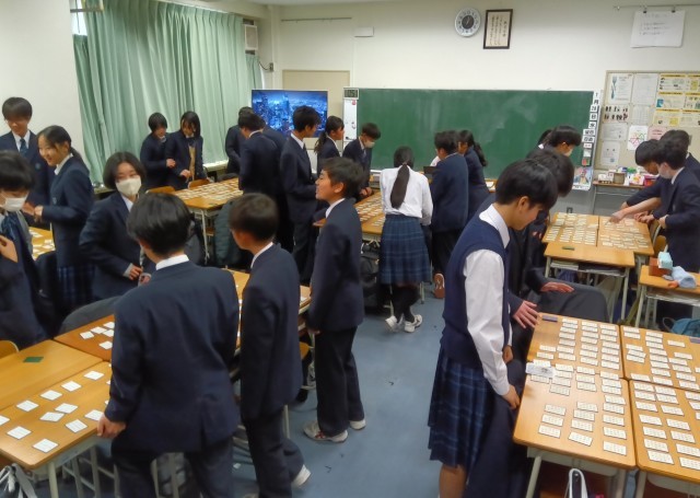 写真は、1年生の教科「日本語」の様子です。読み手の声に集中し、札が取れると歓声やため息が聞こえてきます。「けふ」と書いて「きょう」と読むなど旧仮名遣いの難しさもありますね。明日は、1学年の百人一首大会があります。どうぞお楽しみに。