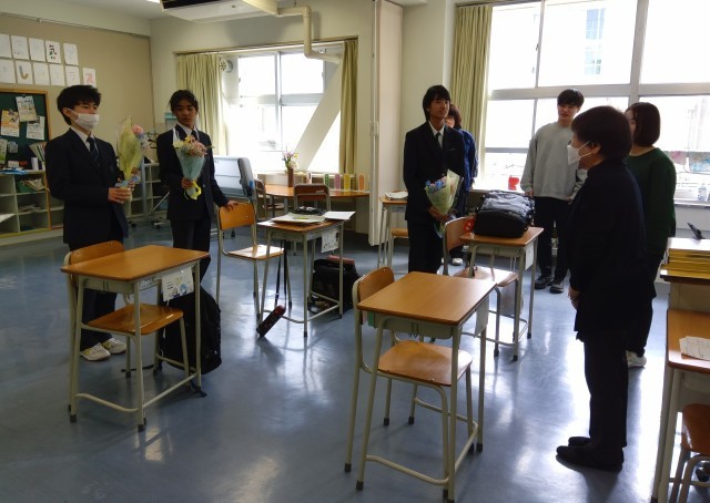 先日の華道体験の講師の方が、3年生に花束を届けてくださいました。