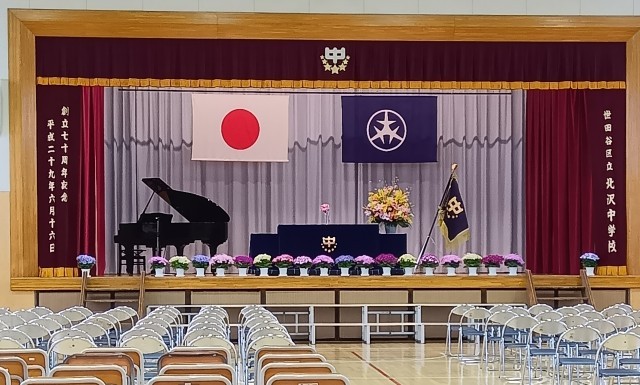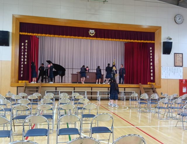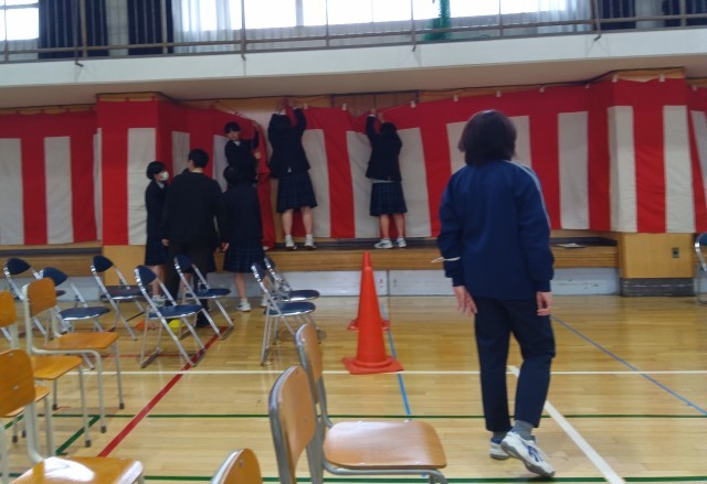 パイプ椅子をきれいに並べ、紅白幕、舞台上の装飾も行いました。