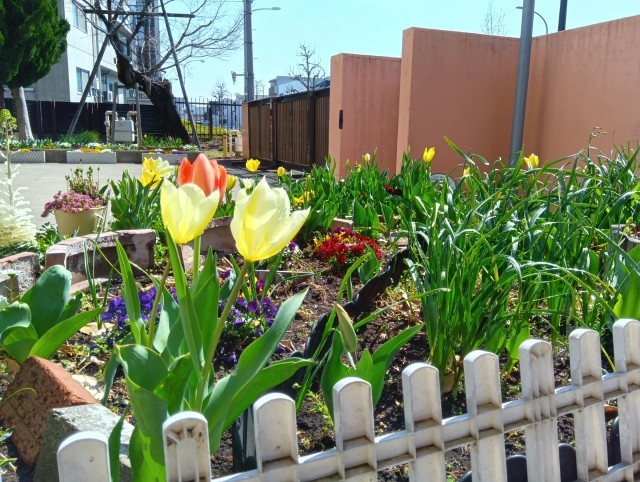 正門の花壇、卒業生が植えたチューリップが咲き始めました。(副校長)