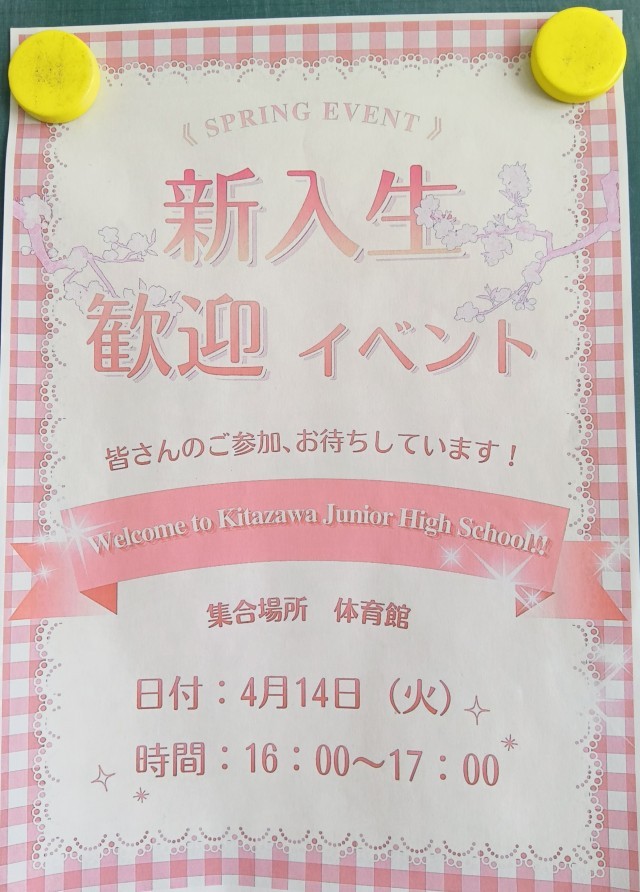 さて、写真は今日放課後に行う生徒会主催新入生歓迎イベントのポスターです。異学年交流による謎解きがありますね。北中ひろばの支援を受けて参加賞もあります。どうぞ思いっきり楽しんでください。(副校長)