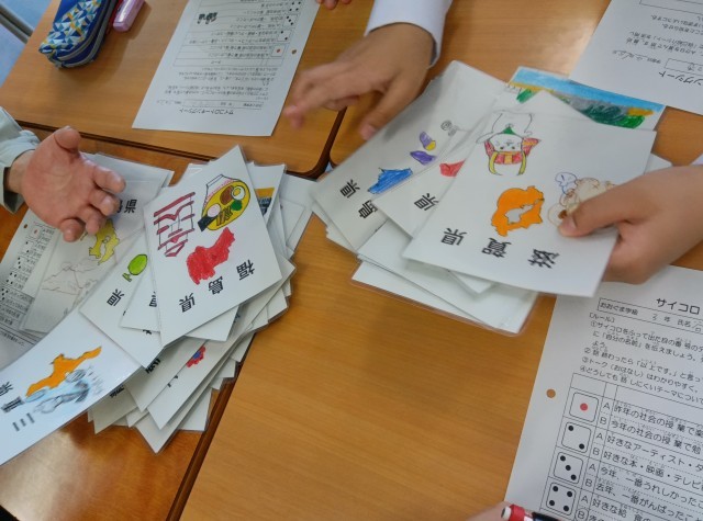 昨年度作った都道府県カルタをみんなで見ながら話し合っています。