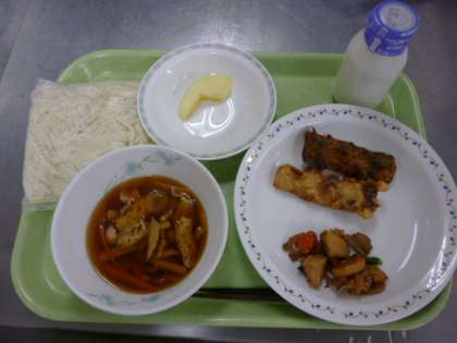 うどんとスパゲティの中間のような麺の「ソフト麺」が時々登場していました。和風のつけ汁やミートソースなど和食にも洋食にも合わせられる学校給食オリジナル料理です。