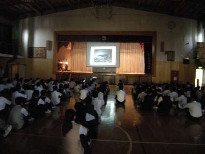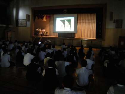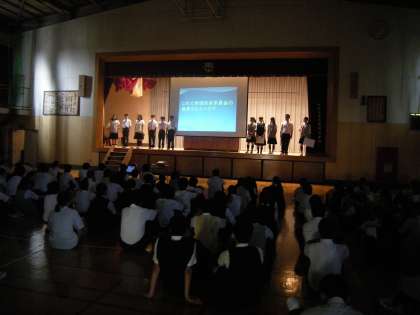6月15日生徒朝礼の後に、保健給食委員会からスライドやクイズを使い、「食器を大切にしよう」をアピールする集会が行われました。食器の縁の欠けた部分を葉っぱのシールを焼き付け、再利用することも紹介されました。