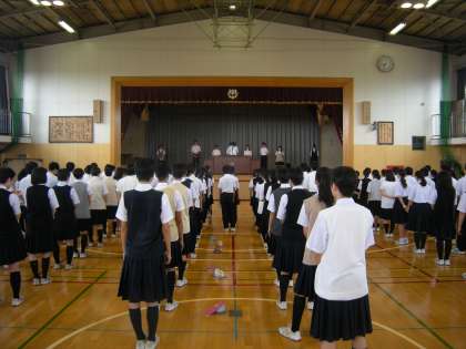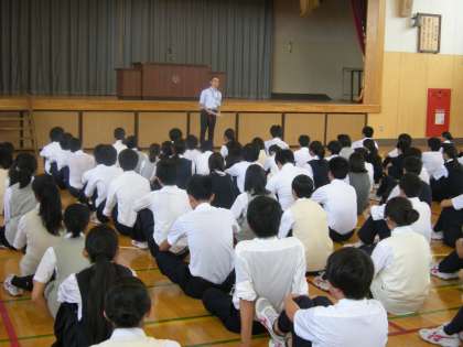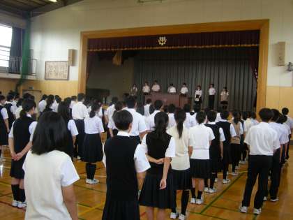 7月13日に、1学期最後の生徒朝礼が行われ、生徒会や各委員会の活動報告がありました。朝礼の後に、副校長先生から、東校舎の改修工事についての注意と説明をしました。