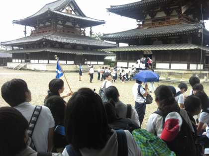 法隆寺に到着し、クラス写真を撮り、ガイドさんの案内で見学します。