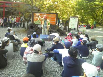 河口湖フィールドセンターで溶岩ドームを散策し、学園に向かっています。