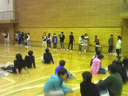1日目の夜は、体育館でレク大会をしています。レク係が準備したレクリエーションをみんなで楽しんでいます。
