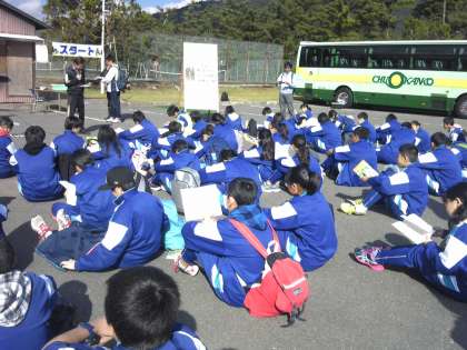 緑の休憩村に到着し、オリエンテーリングの説明を聞いて、オリエンテーリングの開始です。班で協力して、頑張ります。