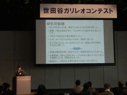 1月30日(土)に二子玉川ライズにおいて、世田谷ガリレオコンテストが行われました。今年度は835件の応募の中から、第1次審査を通過した9組による研究発表で、北沢中学校の1年生も選出され、発表しました。優秀賞のあたるアイデア賞を受賞しました。