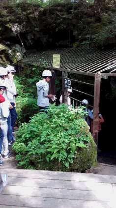 移動教室2日目、最初の見学場所は西湖のコウモリ穴です。安全のため、全員ヘルメットを被って溶岩洞穴に入ります。