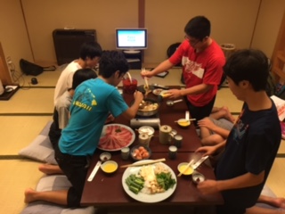 2日目の夕食は、部屋ごとですき焼きです。みんな美味しくいただきます。