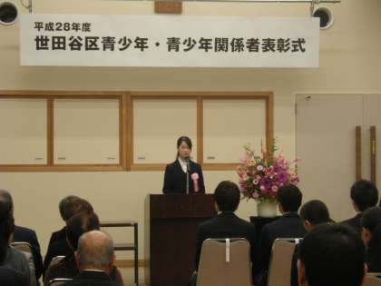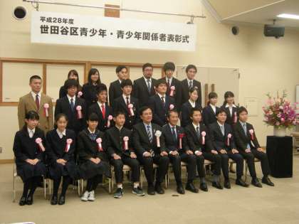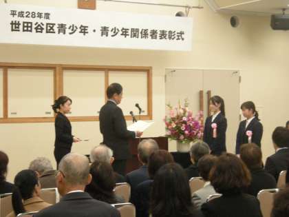 11月13日に世田谷区役所ブライトホールで、青少年・青少年関係者表彰式が行われ、吹奏楽部が表彰されました。地域や近隣小学校の行事やイベントに参加し、地域の絆を深める活動に取り組んでいることで表彰を受け、保坂展人区長より表彰状を渡されました。