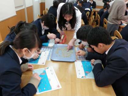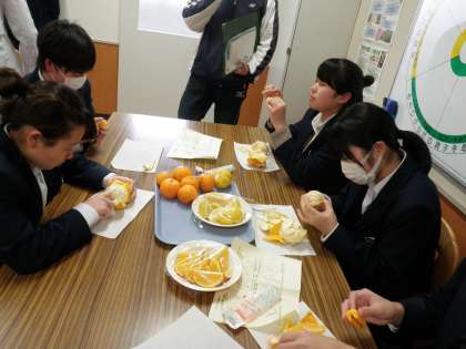 2月22日(水)の5・6時間目に2年生を対象に、食育の授業を行いました。今回のテーマは『山と海をつなぐ恵みの食育』でした。愛媛県の「地域法人無茶々園」の方を講師としてお招きし、「海の仲間たちと漁師さんの話」というタイトルで「ちりめん漁」の話と「ちりめんモンスター探しによる生物多様性の話し」と、「柑橘ができるまで・柑橘類の食べ比べと農業のお話し」というタイトルで「1個のミカンが苗木からできるまでのお話し」や「農家の方が農薬を使いたくない理由」についてお話しをしていただきました。最後に、5種類の柑橘類の食べ比べをしました。