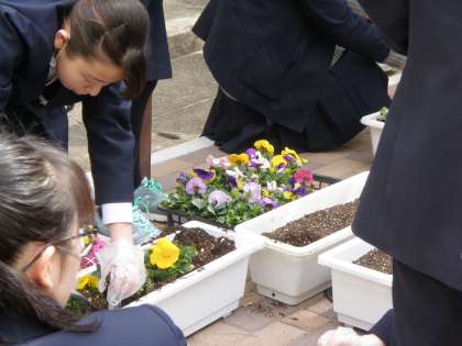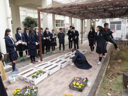 学年末考査が終わった3月1日(水)「パンジーの花植えボランティア活動」を行いました。生徒会役員の呼び掛けに対して30名以上の有志が集まり、プランターや花壇にパンジーの花を植え替えました。150近くあったパンジーの株も、みんなが協力してくれたおかげで、あっという間にプランターに植え替えることができました。