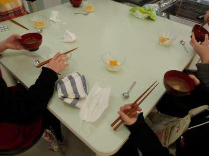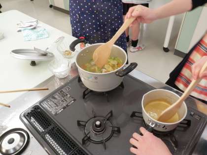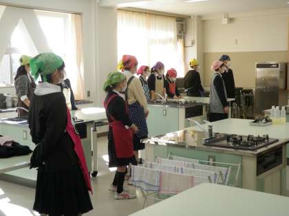 3月9日、1〜2時間目に家庭科の授業で1年生が調理実習を行いました。メニューは、野菜スープと牛乳寒です。どの班も協力して実習を行っていました。
