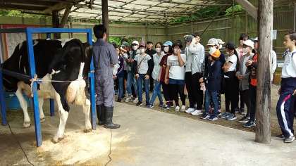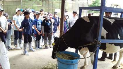 2日目午後のプログラムは、酪農体験です。最初の体験は、牛の乳搾り体験です。