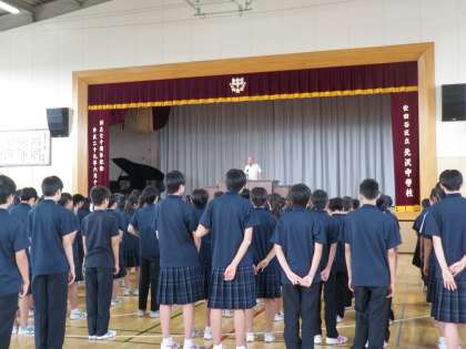 9月2日(月)、令和元年度二学期の始業式を行いました。みな元気な顔を見せてくれました。1年生は移動教室、2年生は職場体験と校外学習、3年生は修学旅行と、どの学年も行事が組まれていますが、しっかりと目標を持ち充実した二学期を過ごしてもらいたいと思います。
