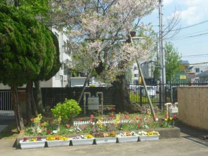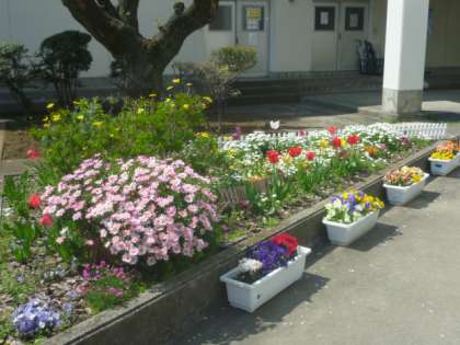 正門前の花々は綺麗に春を告げてくれています。