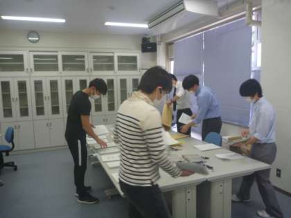先生たちは、丁寧に明日配布する課題と前回回収し添削した課題の袋詰め作業をしています。