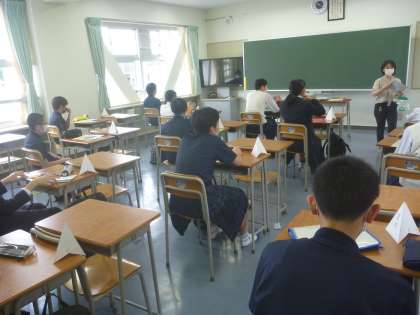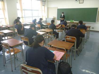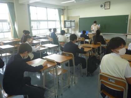 密にならないように、窓と扉を開け、入口は前・出口は後ろで、1教室に15人と1クラスを半分にして、学活を行っています。