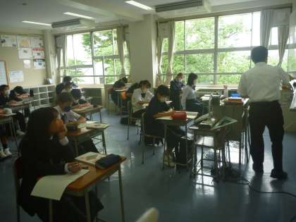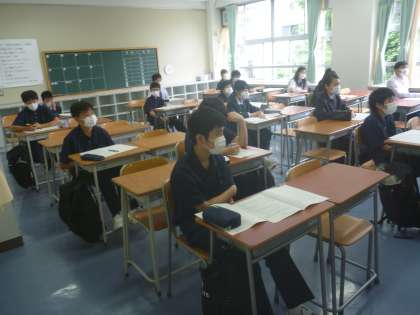 3時間目、1クラスを2つに分かれて、英語・音楽・数学・数学の初めての授業を真剣に受けています。