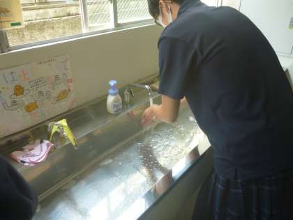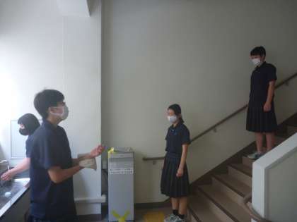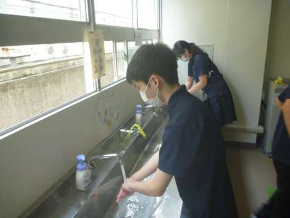 朝登校して、まず手洗いを30秒して、授業が終わるたびに、密にならないように、階段に並び、先生たちがついて、生徒は石鹸をつけて丁寧に手洗いをしています。
