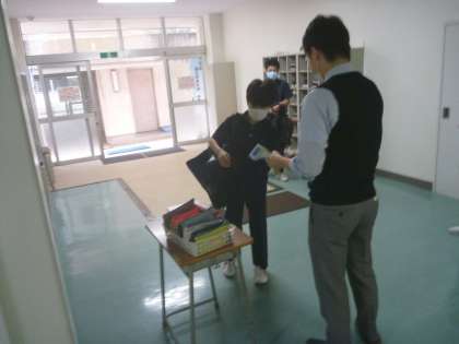 チェックの先生が手に持っている白と水色のものは、おでこにあてるとすぐに体温がわかる体温計を区から頂き、使っています。
