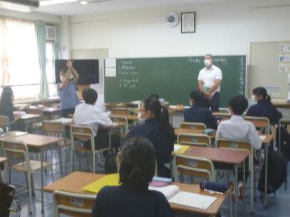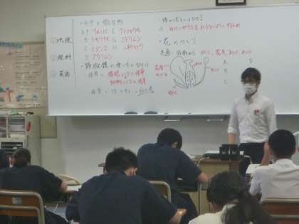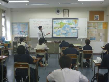 英語の1クラスには、外国人のレン先生も一緒に。理科は花のつくりについて、社会は地理で、ユーラシア大陸の名前の由来は、ヨーロッパとアジアを英語で書いてみると、「そうだったんだ〜」と。
