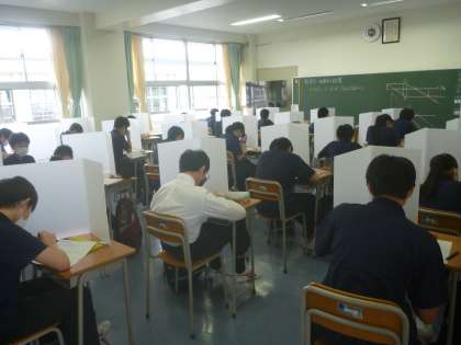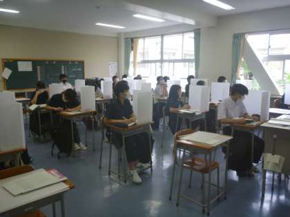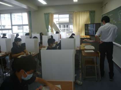 昨日までのテストが終わったので、今日から、飛沫感染予防のために、区から届いたパーテーションを使って、授業を行っています。