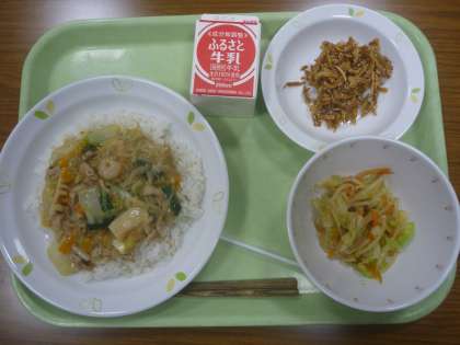 今日は、中華丼・揚げごぼうのごま和え・野菜の中華味・牛乳でした。