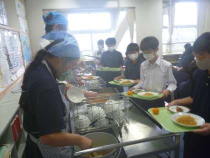 生徒だけで、配膳を始めて5日目。なかなかエプロンがつけられなかったり、三角巾をむすべなかった給食当番も少しずつ早く準備が出来るようになってきました。