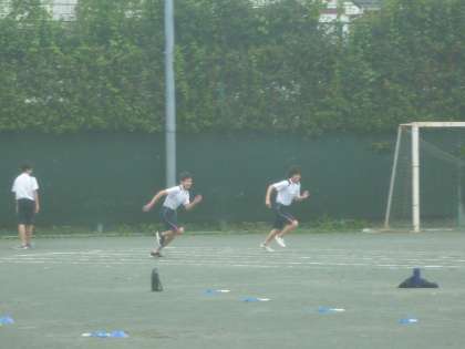 2年男子は、校庭で50m走をソーシャルデイスタンスを守って、2人ずつタイムをはかっています。