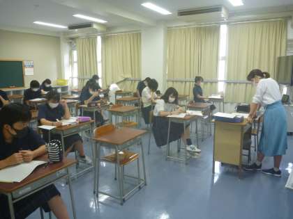 1年生国語は、「起承転結」について。本文を形式段落の番号で、各自プリントに記入し、答え合わせを。