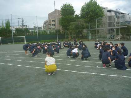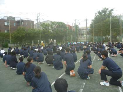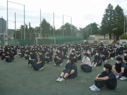 校庭にいた生徒は、その場にしゃがみ、「揺れがおさまりました」の放送で、校舎内の生徒も、校庭に避難しました。