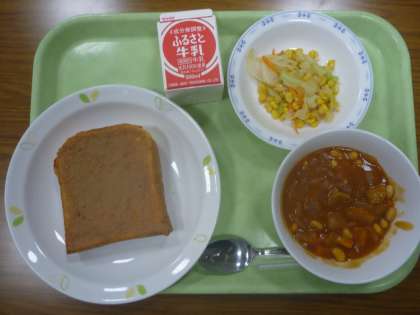 きな粉バタートースト・ポークビーンズ・コーンサラダ・牛乳です。