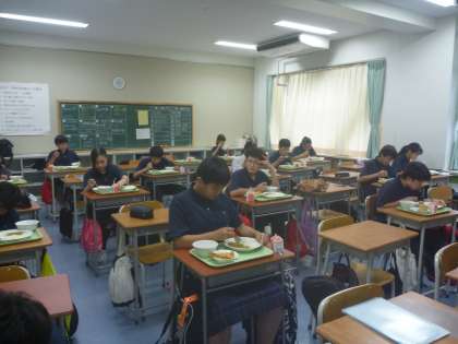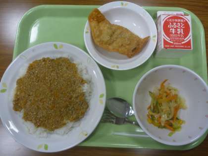 今日は、ドライカレーライス・サモサ・フレンチサラダ・牛乳です。 サモサはインドの軽食だそうです。