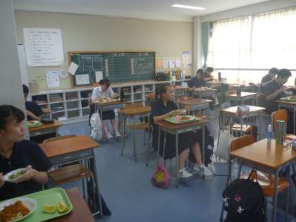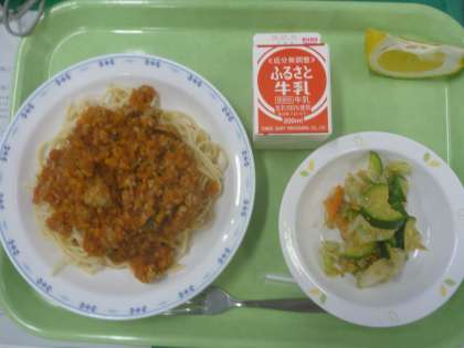 今日は、なす入りスパゲティミートソース・ごまだれ夏野菜サラダ・河内晩柑・牛乳です。 今日もみんな食欲旺盛です。