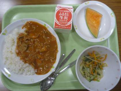 今日は、ハヤシライス・野菜サラダ・メロン・牛乳です。