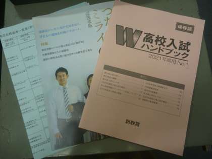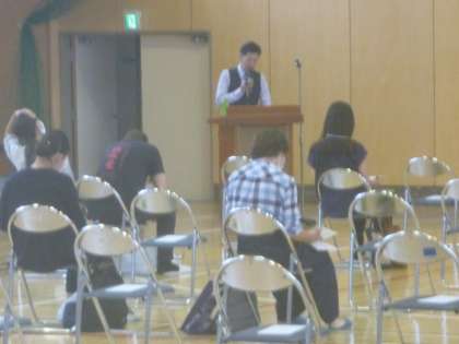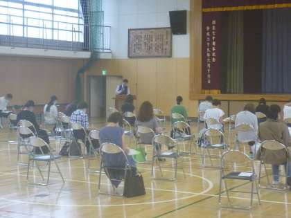 PTA主催の「家庭教育学級」を体育館で行っています。今年の入試対策について、創育の方がいらして、資料をもとにお話し頂いています。