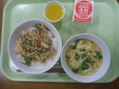 チンジャオロース丼・卵スープ・オレンジゼリー・牛乳です。