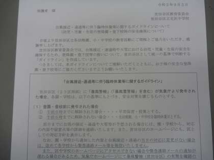本日生徒に「台風接近・通過等に伴う臨時休業等に関するガイドラインについて」のプリントを配布しました。HPの「各種おしらせ」にも掲載されています。ご確認下さい。