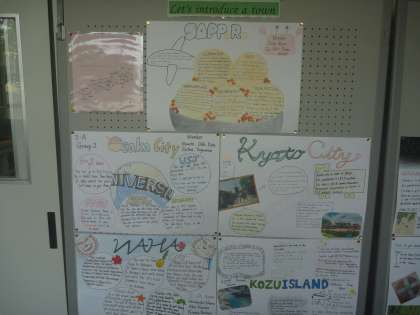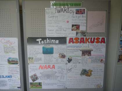 3年生の廊下には、日本の様々な街の紹介を英語で書かれた作品が掲示されてます。